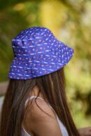 Bright blue bucket hat with a playful fish and strawberry pattern, lightweight and comfortable—perfect for sunny days and casual outings.